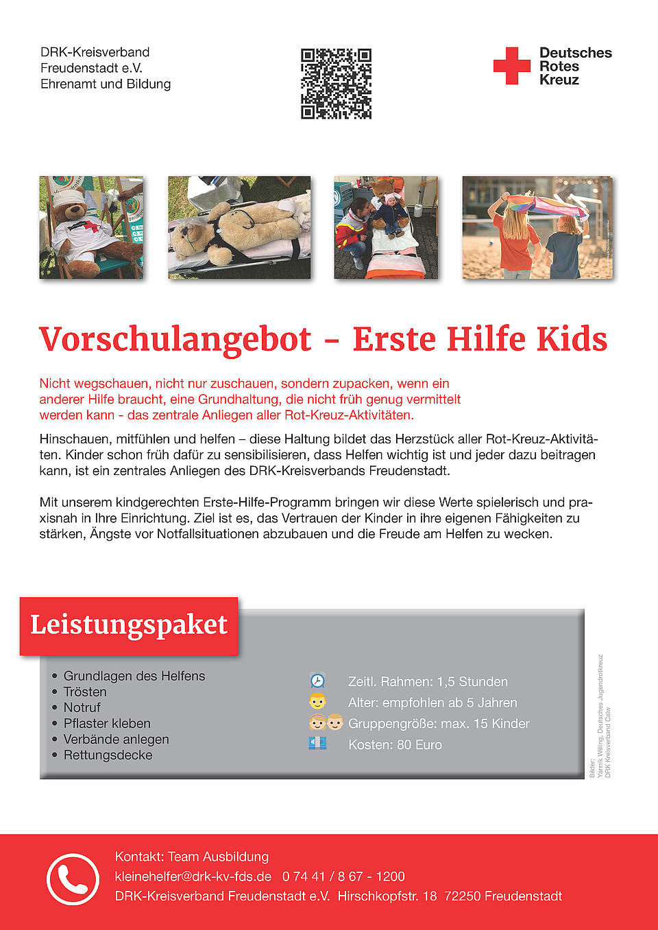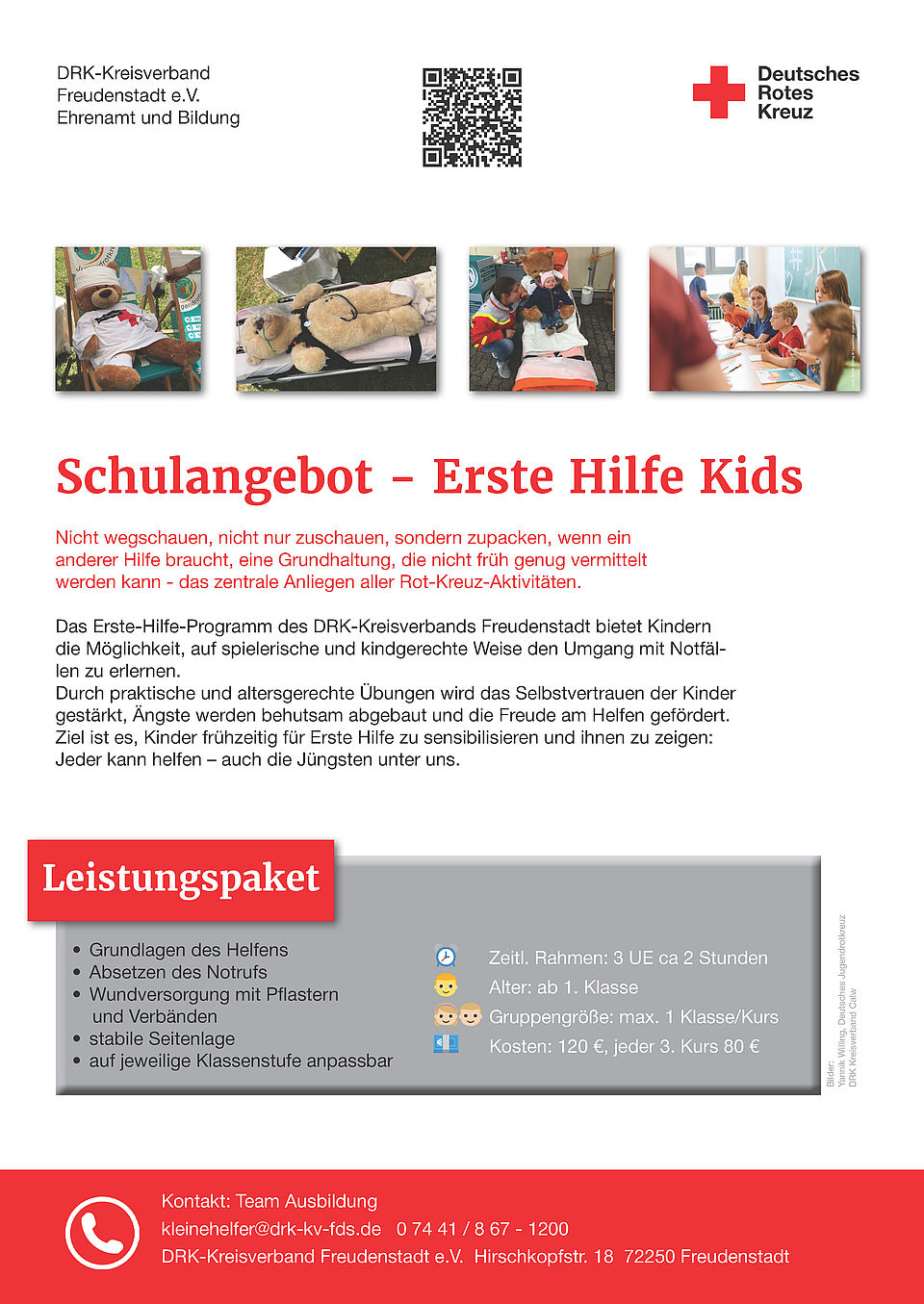 In Verbindung mit dem Fahrradführerschein bieten wir eine Schulung bedarfsgerechter Erste Hilfe an. Die Kinder erfahren, was bei Notfällen im Straßenverkehr zu tun ist. Im handlungsorientierten, fachkundigen Unterricht üben die Kinder den Eigenschutz, Absicherung einer Unfallstelle, den Notruf absetzen, wie man kleine Wundverbände macht, sowie das Verhalten bei Bewusstlosigkeit.
