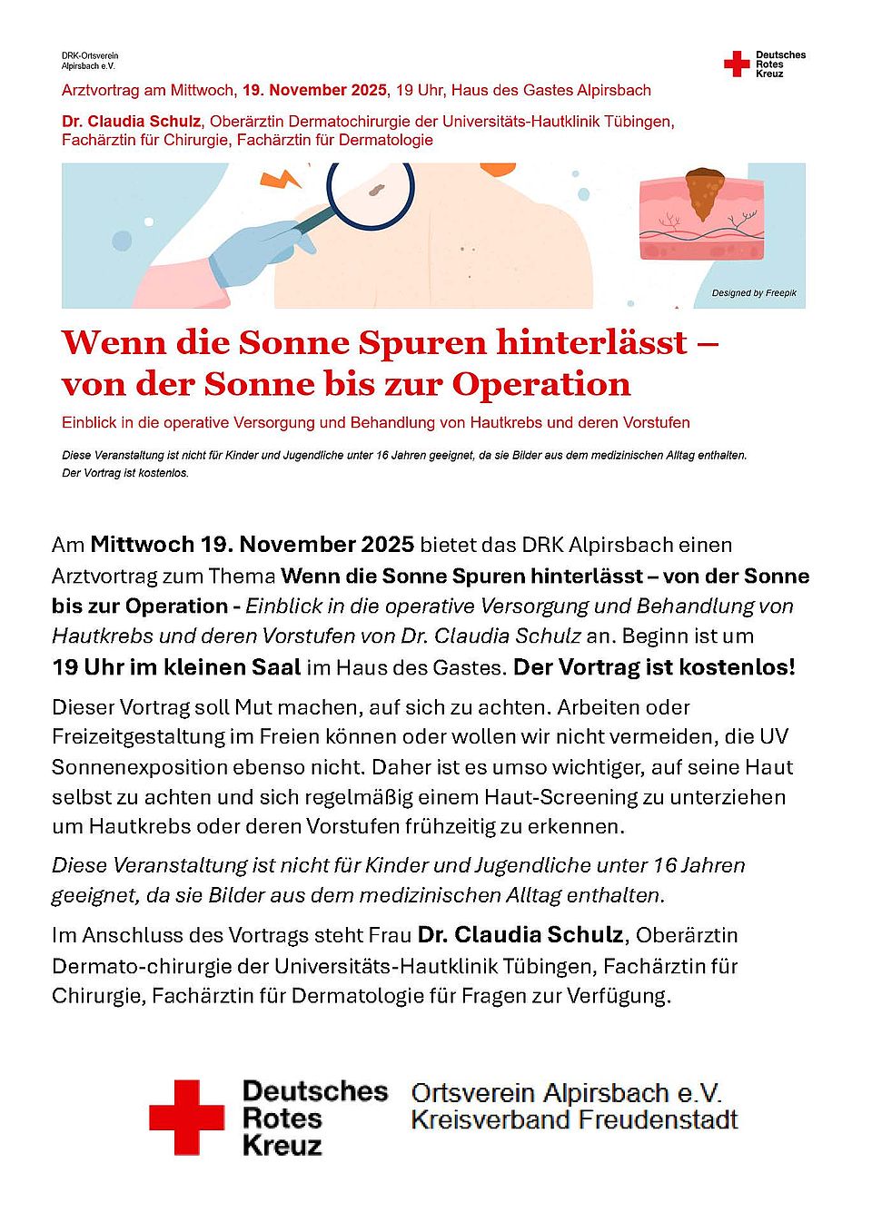 Der Vortrag soll dazu anregen, aufmerksam mit der eigenen Gesundheit umzugehen und die Haut regelmäßig zu beobachten. Wer beruflich oder privat viel im Freien ist, kann die Sonnenstrahlung nicht immer vermeiden – umso wichtiger ist eine regelmäßige Hautkontrolle, um Hautkrebs oder dessen Vorstufen frühzeitig zu erkennen.