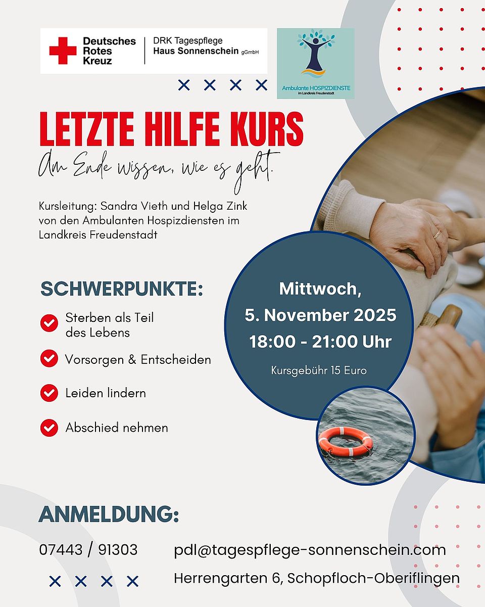 Am 05. November 2025 fand in unserer Tagespflege Sonnenschein ein ganz besonderer Abend statt: Der „Letzte-Hilfe-Kurs“ für pflegende Angehörige, Pflegekräfte und Interessierte. Unter der fachkundigen Leitung der ambulanten Hospizdienste durften wir uns einem Thema widmen, das oft im Verborgenen bleibt – dem Sterben als Teil des Lebens.