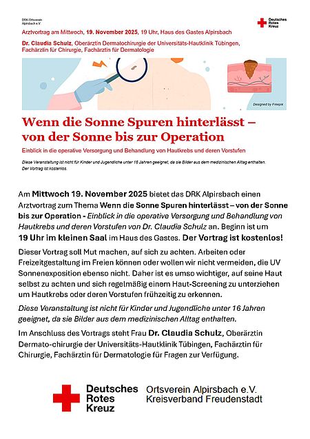 Das Deutsche Rote Kreuz Alpirsbach lädt am Mittwoch, 19. November 2025, zu einem öffentlichen Arztvortrag mit Dr. Claudia Schulz ein. Beginn ist um 19:00 Uhr im kleinen Saal des Hauses des Gastes in Alpirsbach. Der Eintritt ist frei.