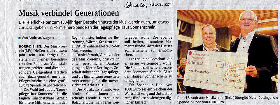 Beim festlichen Jahreskonzert zum 100-jährigen Bestehen des Musikvereins Dießen durfte sich die Tagespflege Haus Sonnenschein über eine besondere Anerkennung freuen: Der Verein überreichte uns eine Spende in Höhe von 1000 Euro als Wertschätzung für unsere Arbeit mit älteren Menschen in der Region.